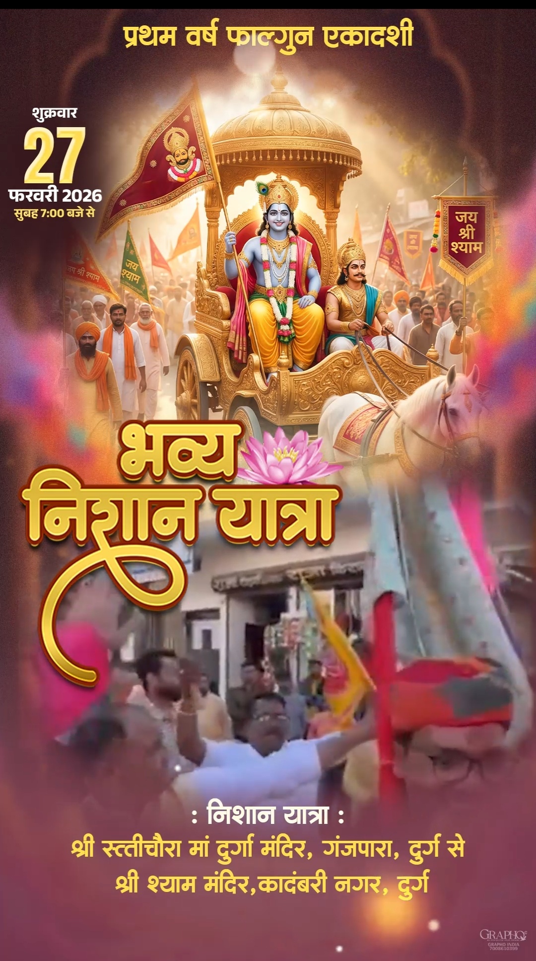 आप सभी से आग्रह है इस प्रयास में अपना साथ देते हुए इस भव्य निशान यात्रा में सम्मलित होकर इस निशान यात्रा को सफल बनाने में अपनी सहभागिता दिखाये।हमारा प्रयास है आप सभी की उपस्थिति में सुंदर भजनों में झूमते हुए घोड़ा, बग्गी, रथ और बाबा श्याम के अमृत रंगों एवं सुगंधित इत्रों की बरसात के साथ हम सभी इस फाल्गुन एकादशी दिनांक 27 फरवरी को रिंग्स रूपी गेट श्री सत्तीचौरा माँ दुर्गा मंदिर से भव्य एवं ऐतहासिक निशान यात्रा हो, जिसकी गूंज बाबा श्याम के धाम खाटू तक जाए और सभी भक्तों को बाबा का आशीर्वाद मिले…